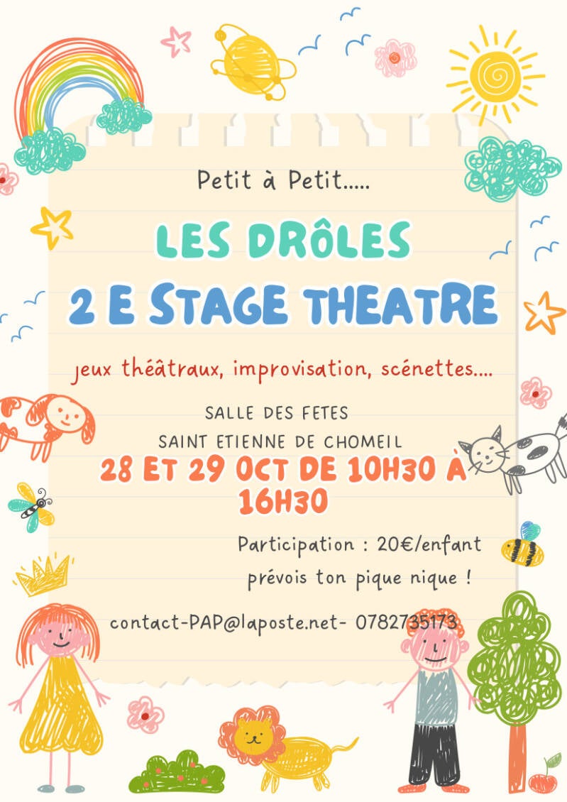 UN PETIT GROUPE D'ENFANTS s'EST Retrouvé EN JUILLET 2024, POUR UN STAGE DE 2 JOURS DE THÉÂTRE, autour de la création de scénettes liées à leur quotidien. Un rendu aux familles a permis de mettre en valeur leur création. Ce groupe se retrouvera a chaque petites vacances afin de créer une dynamique et un projet sur l’année avec représentation.